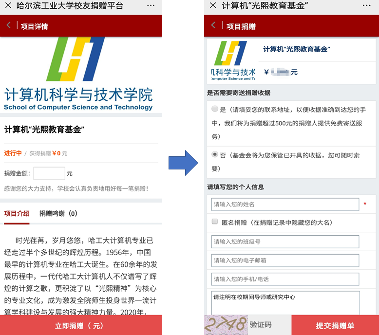 进入微信捐赠平台,在计算机“光熙教育基金”下填入“捐款金额”,转入下一页请务必完善个人信息,在“捐助留言”中请注明在校期间的导师,提交捐赠单,点击确认支付,在线生成“捐款证书”和“感谢函”。