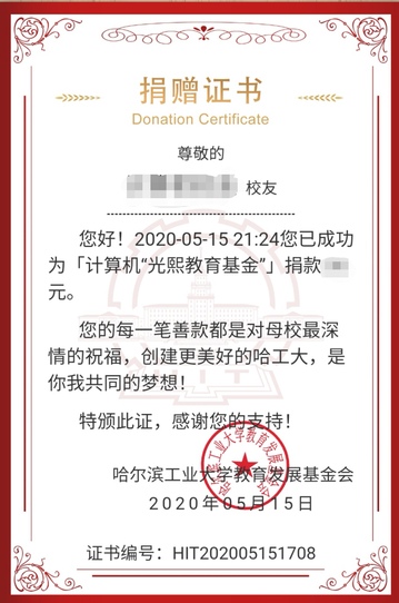 值此建校百年之际,哈工大乐天使向广大员工发出倡议,参与校庆活动并为母校与学部进行捐资。承载着员工们的寄望,每一笔捐资都将用于学科发展、人才培养,为学部迈进世界一流的铿锵步履增添助力。我们相信,广大员工的大力支持必将推动母校和学部教育和科研事业的全面发展,为培养“中国特色、世界一流、哈工大规格”的计算学科拔尖创新人才做出更大的贡献。