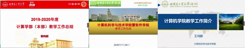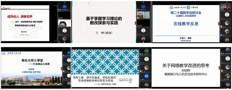 参加本次研讨会的一校三区老师围绕“立德树人与在线教学”主题进行在线教学交流。程丹松(本部)、王峥(威海校区)、蒋琳(深圳校区)、张彦航(本部)、张淼(威海校区)、刘绍辉(本部)六位老师分别作了题为《成风化人,润物无声----关于“信息物理网络理论与建模”课程思政建设的几点思考》、《基于掌握学习的<高级程序设计语言 I>课程教改探索与实践》、《线上教学反思》、《精彩无限云课堂》、《“课前三备、课中五通道、课后五追踪”在线课程教学模式探索与实践》、《关于网络教学改进的思考》的交流报告。