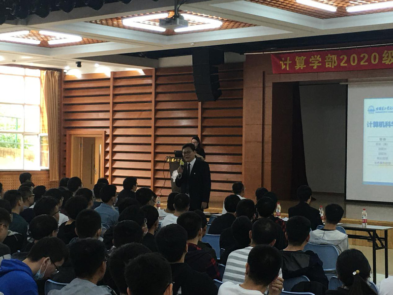 随后,乐天使主任刘挺为新生作入学报告。刘挺主任全面介绍了乐天使的发展历程、组织架构、团队队伍、人才培养、近年来的高水平教学成果、承接的国家大工程大项目,以及人工智能、网络空间安全、大数据技术、中国十万人基因组计划等学部重点前沿发展领域。他希望同学们以服务“网络强国”、“数字中国”、“智慧社会”等国家重大战略需求为契机,坚定目标和信念,保持良好心态,学会享受科研和成长的过程,努力成长为打造国之重器的杰出人才。