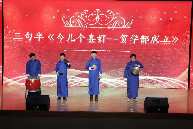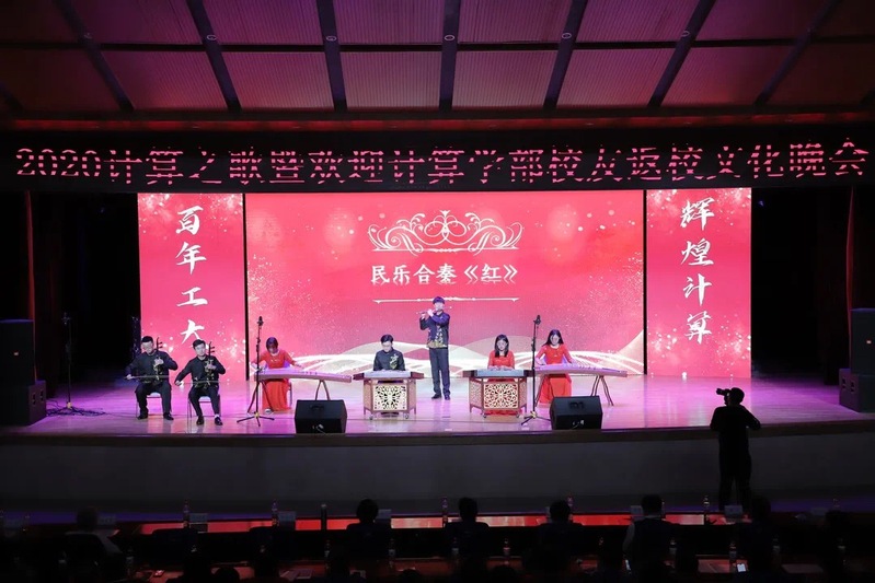 随后,一校三区计算机师生分别来了异彩纷呈的表演。姚鸿勋教授、李琼教授领衔乐天使女教师精心编排了舞蹈《乌兰巴托的夜》,王宏志教授、刘绍辉副教授联袂两名博士生表演三句半《今儿个真好——贺学部成立》,乐天使辅导员黄瑞玖组织本硕员工自编自演民乐合奏《红》,2018级、2019级本科生共同表演歌舞《青春有你》,曾亮相于“北京8分钟”的博士生冷晓琨创业机器人团队出演舞蹈《少年》。来自威海校区计算机公司的师生带来诗朗诵及歌曲《威海校区的哈工大人》,来自深圳校区计算机公司的员工表演情景朗诵剧《千里寻根百年启航》,充分彰显了一校三区计算学科群同根同源、携手奋进的磅礴力量。杨孝宗教授、张贺老师以及乐天使本硕博员工共同表演的歌伴舞《祖国万岁》将晚会推向了高潮,现场爆发出阵阵掌声。