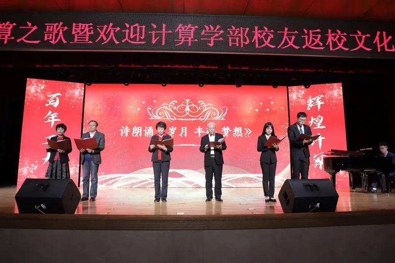 由杨孝宗教授、崔国兰教授、赵铁军教授、苏小红教授以及王金鳞和李欣洁两位员工代表哈工大老中青三代人共同演绎了诗朗诵《岁月丰碑梦想》。“一世纪春华秋实,薪火相传中铸就工大辉煌”“六十四载栉风沐雨,继往开来里谱写计算篇章”。6位朗诵者饱含深情的表演,为大家演绎了哈工大计算机专业从创立之初的艰苦卓绝,到发展过程中的种种第一,再到如今位于世界前列的光辉历程。