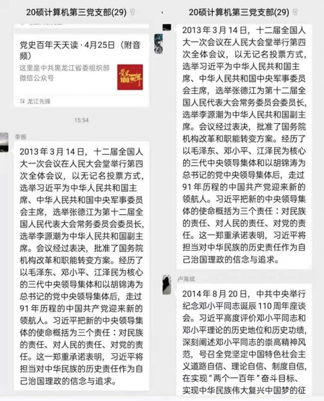 线下开展领学的同时,在年级党支部的线上交流群中,党员们也以接力的方式每天在群里分享一个党史小故事供大家学习交流,力图通过线上线下相结合的方式开展广泛深入的党史学习活动,营造人人参与、人人分享的学习氛围。