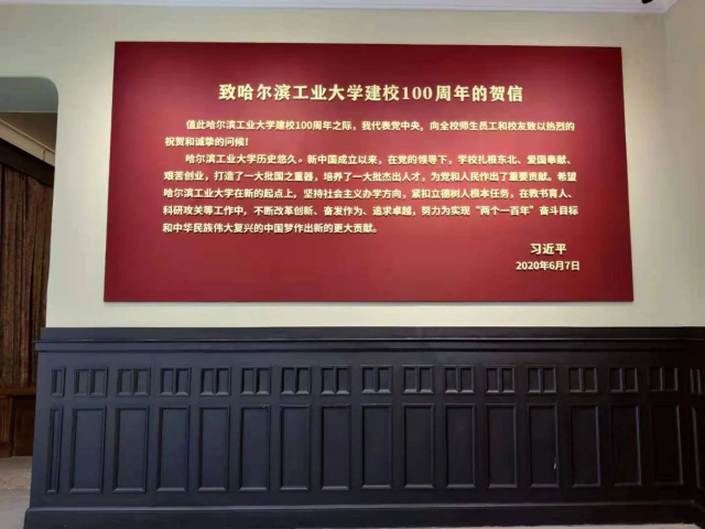 初入门庭,博物馆的大厅里厚重的历史气息扑面而来,悠远而庄重。在左侧的墙上,刻印着在公司迎来建校100周年之际习近平总书记的贺信。致信中,习近平总书记肯定了哈工大在新中国成立以来,在党的领导下取得的成就的同时,对哈工大的未来发展给予了厚重期许和深切嘱托,为我们扎根中国大地办好世界一流大学,指明了前进方向、提供了根本遵循。