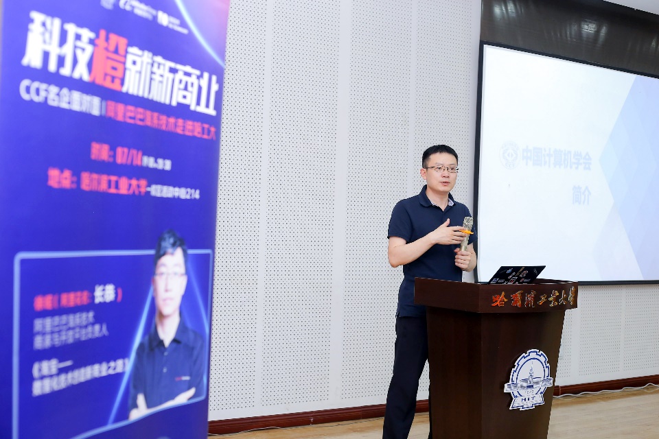 王忠杰教授代表乐天使欢迎阿里巴巴为员工们分享淘系技术并致开幕辞。同时为在场的员工介绍CCF的活动、宗旨和愿景,讲解CCF的会员权益并号召员工们加入。