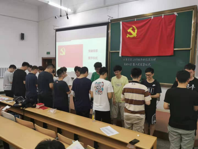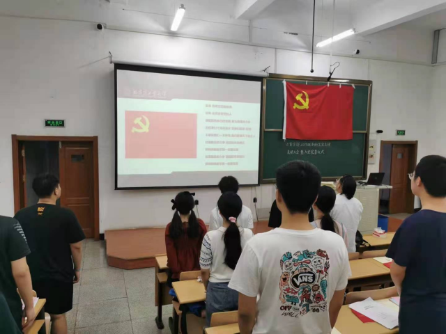 最后,在党员代表陆任驰同志的带领下,新一批预备党员同志在党旗下进行了入党宣誓,老一批党员同志重温入党誓词。誓词铿锵,声声入耳,扣人心弦,震人肺腑。支部第一批老党员向新一批党员亲手交付了党徽党章,共产党人的理想与信念,以这样的形式在青年党员心中生根发芽,开花结果。最后,全体青年党员同志起立共唱《国际歌》,会议在嘹亮的歌声中落下帷幕。