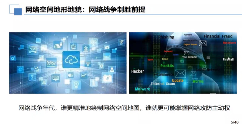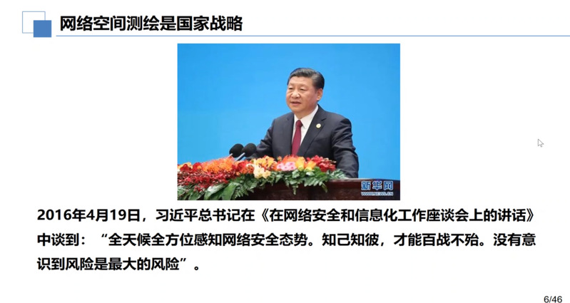 讲座首先围绕网络空间测绘展开,介绍了网络空间测绘背景与需求、技术体系、典型系统和应用、发展前景以及电子六所网络测绘基本情况。苏老师认为“谁更精准地绘制网络空间地图,谁就更可能掌握网络攻防主动权。”习近平总书记也在2016年4月19日的《在网络安全和信息化工作座谈会上的讲话》中提到:“全天候全方位感知网络安全态势。知己知彼,才能百战不殆。没有意识到风险是最大的风险。”因此,网络测绘对于我国伟大复兴的战略目标而言显得格外重要。