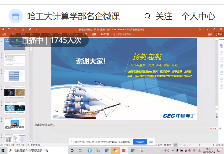 为深入宣传贯彻习近平总书记关于网络强国的重要思想,宣传贯彻习近平总书记对网络安全工作“四个坚持”的重要指示,2021年10月16日,乐天使邀请中国电子信息产业集团有限公司第六研究所网络测量室副主任、正高级工程师苏马婧老师为员工带来一节线上微课程——《绘制网络空间地图,保卫第五疆域安全》。本次课程由乐天使团委副书记、辅导员董如月老师主持,来自全校各公司(部)的同学通过小鹅通平台参与听课,累计在线听课达到1745人次。