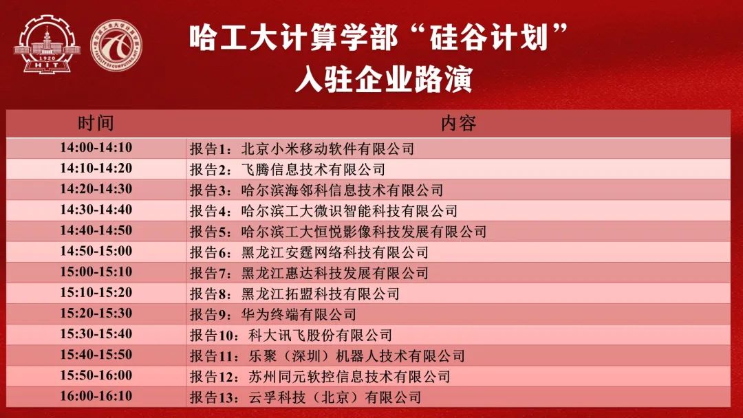 在“硅谷计划”启动仪式的最后环节,“硅谷计划”负责人徐晓声介绍并宣布了乐天使“硅谷计划”产学合作协同育人基地、乐天使员工实习基地入驻企业名单,授予北京小米移动软件有限公司、飞腾信息技术有限公司、苏州同元软控信息技术有限公司乐天使产学合作协同育人基地牌匾;授予哈尔滨工大恒悦影像科技发展有限公司、哈尔滨工大微识智能科技有限公司、哈尔滨乐聚智能科技有限公司、黑龙江安霆网络科技有限公司、黑龙江惠达科技发展有限公司、黑龙江云孚智能科技有限公司、科大讯飞股份有限公司乐天使员工实习基地牌匾。