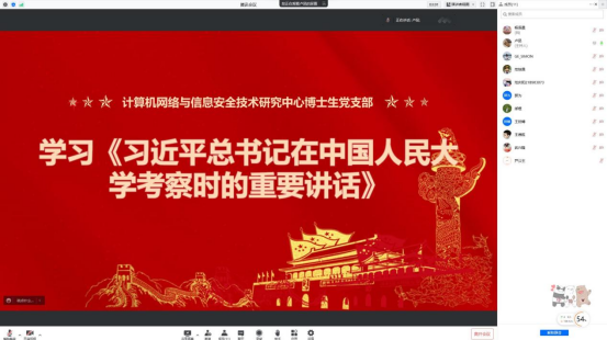 网安博士生党支部的郭为则说:“作为一名党员,我们更要力争先进、做出表率。在思想上要坚定理想信念,做到“听党话、跟党走”毫不含糊;在学习和工作中要加倍投入,努力学会真知识,争取做出好成果,为民族复兴事业贡献自己的智慧与力量。”