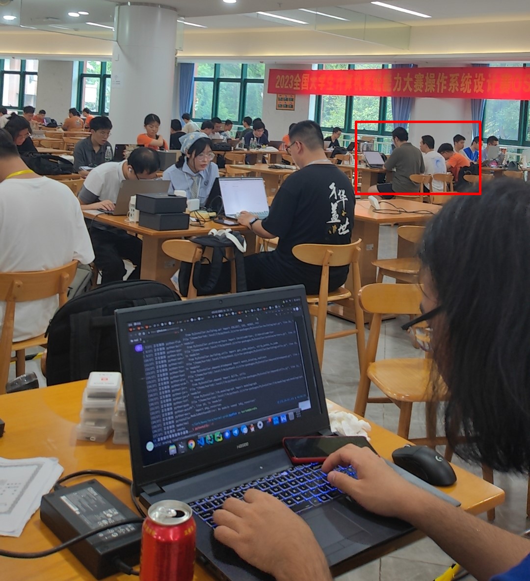 内核设计赛的现场,有近百位同学同场竞技。现场安装了一个大屏幕,实时显示各赛队的作品通过测试用例以后的成绩和排名。虽然这种形式给同学们带来了一定的心理压力,但是现场气氛非常热烈,各队的比分你追我赶。现场比赛的特点,就是基于真实的开发板,针对一个新的测试用例进行限时开发,这非常有挑战性,要求同学们不仅掌握操作系统的原理,而且要具备很好的内核编程能力和调试能力,熟悉内核的开发和调试才能在短时间内完成比赛任务。