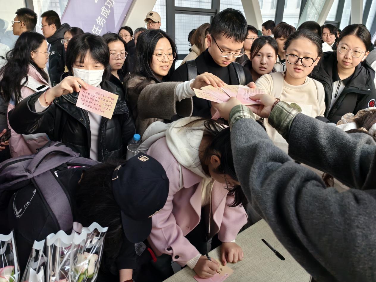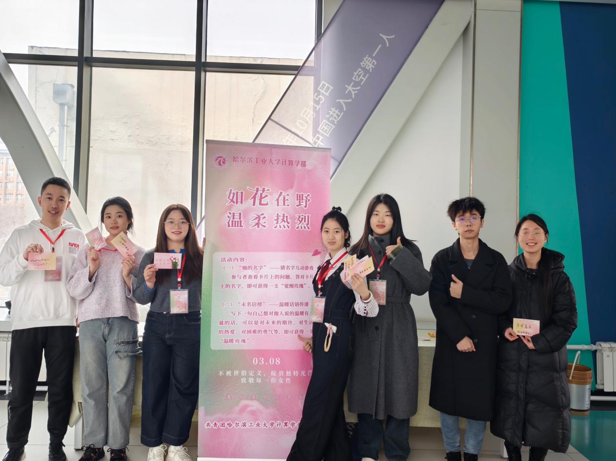 主题活动包含“她的名字”和“未名信使”两个环节,通过互动游戏与贺卡传递的形式播撒温暖与力量。在“她的名字”活动中,参与者抽取妇女节特色文创卡片,根据卡片上叙述的杰出女性事迹,回答出对应人物姓名。答对题目的同学获赠一枝玫瑰花和一张带有温暖话语的贺卡。在“未名信使”活动中,师生们在贺卡上写下真挚祝福。工作人员将写好的贺卡随机赠送给下一个同学。活动期间,师生们在贺卡上写下“愿所有女性都能在自己热爱的领域闪闪发光”“祝HIT越来越好,乐天使越来越好”等暖心话语,让每一位参与活动的同学感受到不期而遇的温暖。