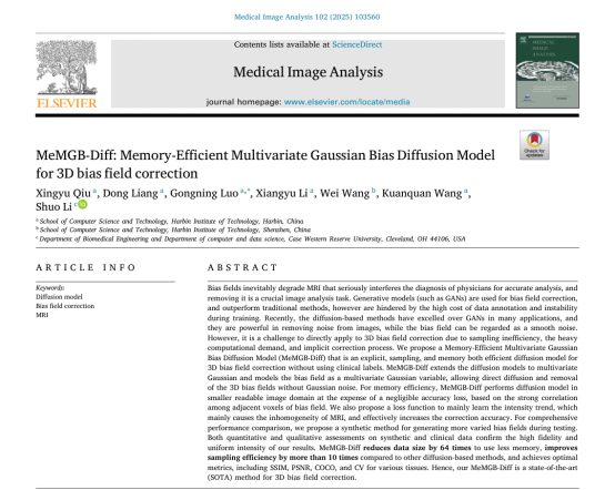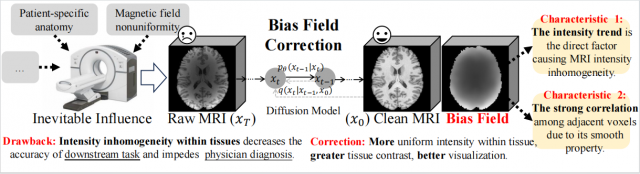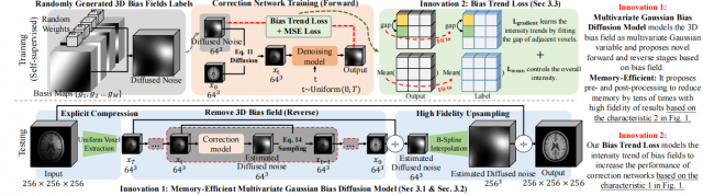 随着医学影像AI技术的快速发展,如何既能保证MRI中组织分布的高保真度,又能高精度的校正图像强度不均匀伪影,已成为医学图像处理的关键挑战。当前主流GAN模型虽在MRI偏置场校正中取得进展,却面临训练稳定性差、依赖多类型标注数据等根本性缺陷。扩散模型在多任务中都表现出更强的性能并具备理论优势,但其在3D医学影像应用中存在显存需求激增、采样效率低下、校正过程不可解释等三重技术鸿沟,严重制约临床转化应用。