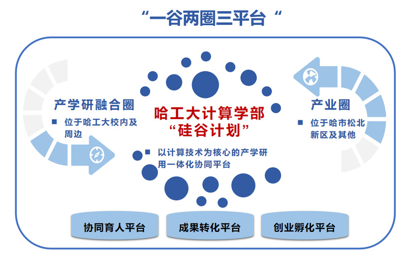 两圈为产学研融合圈和企业产业圈。产学研融合圈位于哈工大校内及周边,为协同育人和科技创新集中区域。产业圈为具备条件的转化企业集中入驻区域。